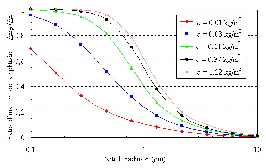 Lorsque la masse volumique de l'écoulement diminue, on constate que les particules sont moins aptes à restituer les fluctuations de vitesse. En théorie, l'accélération d'une sphère due au fluide dépend de l'inverse du carré du rayon selon la loi de Stokes (écoulement continu), alors que pour un écoulement hautement raréfié cette accélération ne dépend que de l'inverse du rayon. On voit sur la figure que lorsque la masse volumique de l'écoulement diminue le rapport Dup/Du dépend moins du rayon, la pente de la courbe étant alors moins importante. Ce phénomène a pour conséquence que bien que les grosses particules ne soient pas capables de restituer les hautes fréquences, l'inconvénient de l'écart obtenu par rapport au cas où l'on utilise de petites particules devient peut être moins important que l'avantage d'utiliser de grosses particules pour obtenir un signal réfléchi suffisant. |