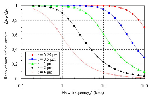Le paramètre le plus important est la taille des particules. Le cas présenté correspond à des conditions atmosphériques normales. L'écoulement autour de la particule est légèrement raréfié (0.006 < Kn < 0.09). Comme attendu, les grosses particules sont moins aptes à restituer les fluctuations à hautes fréquences. Par exemple, pour un rayon de 4 mm une particule ne peut répondre à 80% qu'à des fréquences allant jusqu'à 0.5 kHz, alors qu'une particule de rayon 0.25 mm peut répondre correctement jusqu'à 75 kHz. |