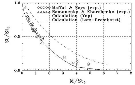 L'injection de gaz à travers la paroi a pour effet de modifier la couche limite turbulente. Le paramètre d'injection est le rapport M=vp/u¥. Le nombre de Stanton (St), caractérisant le rapport entre le flux de chaleur à la paroi et le flux de chaleur par convection, diminue notablement comparé au cas sans injection (St0). La figure ci-dessus expose des résultats expérimentaux ainsi que des résultats de simulations numériques réalisées à l'aide de modèles de turbulence différents. Le modèle de Lam-Bremhorst est un modèle k-e "classique", celui de Yap est une correction du précédent, qui prend en compte le détachement de la couche limite dû à l'injection. Le modèle de Yap donne des résultats plus en accord avec les expériences. |
